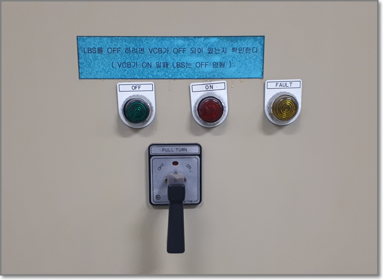 - LBS를 개방하려면 VCB가 차단되어 있는지 확인한다. ( VCB 가 ON 일 때 LBS는 OFF 안됨)라고 스티커가 붙여져 있다.