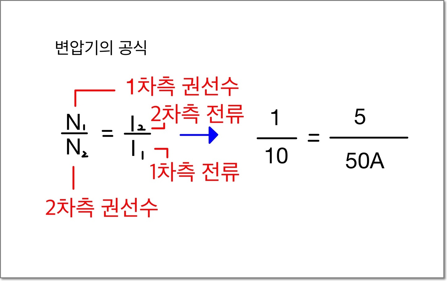 전류는 변압기 권선과 청개구리 기질이 있습니다. 1차측이 50A인데 2차 측은 5A를 만들어야 합니다. 그러면 권선을 1차 측보다 2차 측을 훨씬 많이 감아야 합니다. 즉 2차 측을 많이 감으면 감을수록 전류가 줄어들고 전압은 2차 측을 많이 감으면 감을수록 전압이 높아집니다.