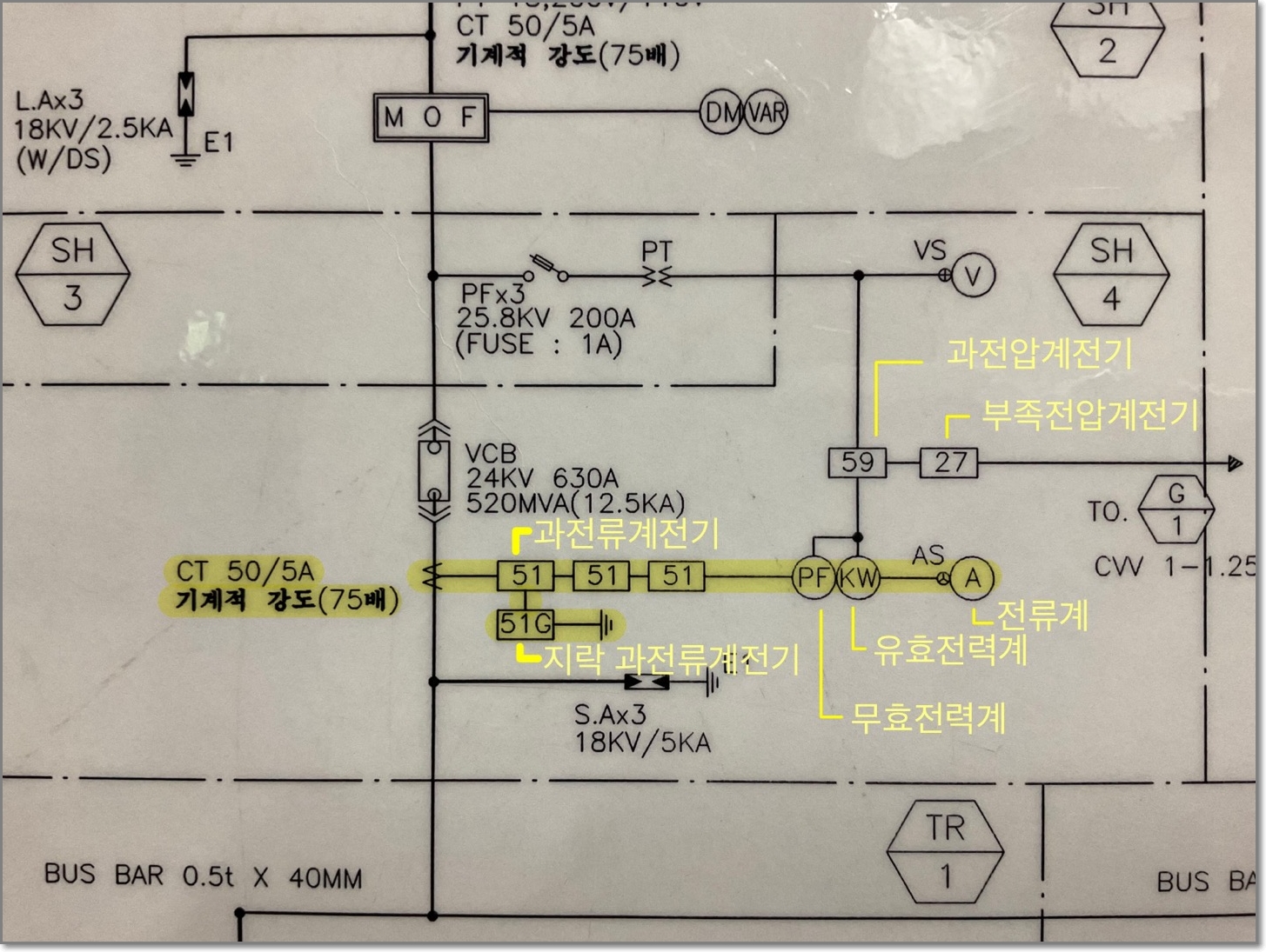 색칠표시된 곳을 보면 CT는 PT와 다르게 회로 선 위에 올려져 있는 것을 볼 수 있습니다. 위에서 설명한 것처럼 전류가 흐르고 있는 흐름에 올라타 있는 것입니다. 그 옆으로 계전기 들과 측정기기에게 소전류를 공급하고 있는 것이 보입니다.