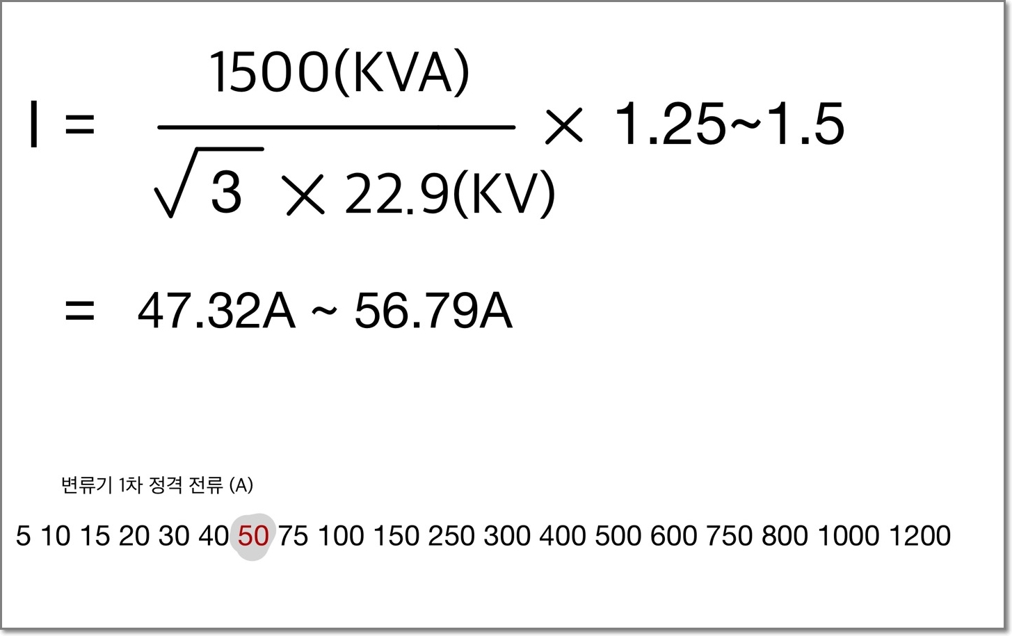 사진을 보면 CT 비는 50/5A의 용량을 가지고 있습니다 어떻게 선정된 것일까요? CT 비를 구할 때는 내가 구하고자 하는 CT가 얼마만큼의 선간 전압과 변압기를 감당하고 있는지 알아야 합니다. 먼저 CT의 위쪽으로 22.9 KV가 들어오고 있습니다. CT의 아래로는 1500 KVA 용량(사진 생략)의 변압기가 있습니다.
