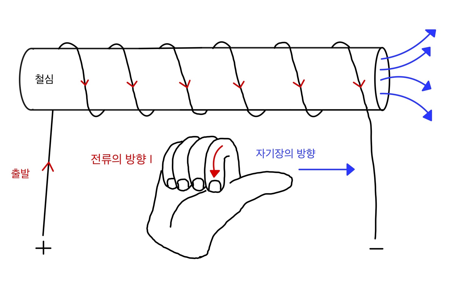 철심에 도선을 감게 되면 한 선에서 흐르는 법칙이 반대가 됩니다. 엄지의 방향이 자기장이 되고 , 나머지 감기는 손의 방향이 전류가 됩니다. 이 원리는 반드시 익혀두시길 바랍니다. 변압기의 원리와 교류전류를 이해하는데 도움이 됩니다.