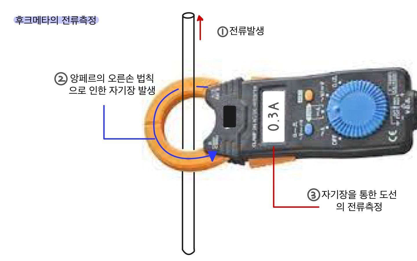 후크메타에 2개의 선을 걸게 되면 각각 전선에서 발생하는 자기장이 서로 상쇄되어 , 측정이 되지 않는다. 그래서 한선만 걸어서 측정해야 한다.