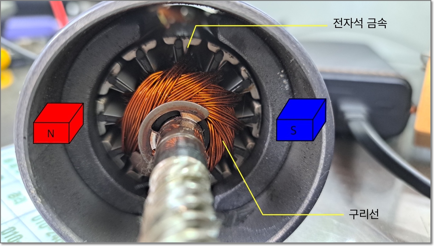 금속에 코일을 여러 번 감아 영구자석 사이에 넣은 다음 코일에 전기를 인가하면 모터가 회전하는 방식입니다. 철덩어리에 코일을 감아 전류가 흐르면 전자석이 되어 플레밍의 왼손법칙에 의해 힘이 발생하여 모터가 회전하는 것입니다.