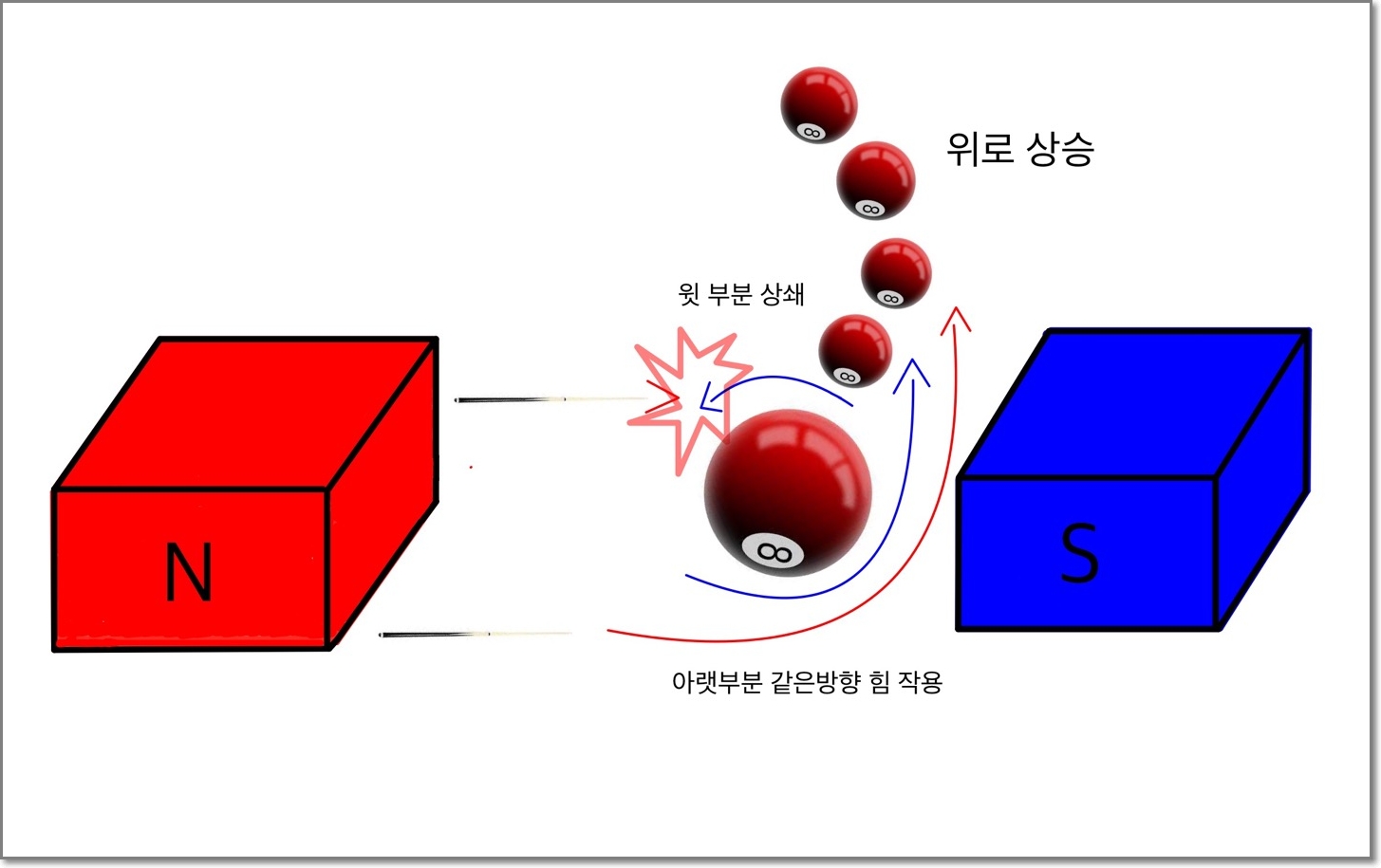 자기장의 방향이 왼쪽 방향으로 형성되면 영구자석의 자기장이 윗부분은 힘이 상쇄되고 당구공의 아랫부분을 치게 된다. 당연히 당구공은 아랫부분의 타격을 받고 스핀을 하며 위로 올라가게 될 것이다.