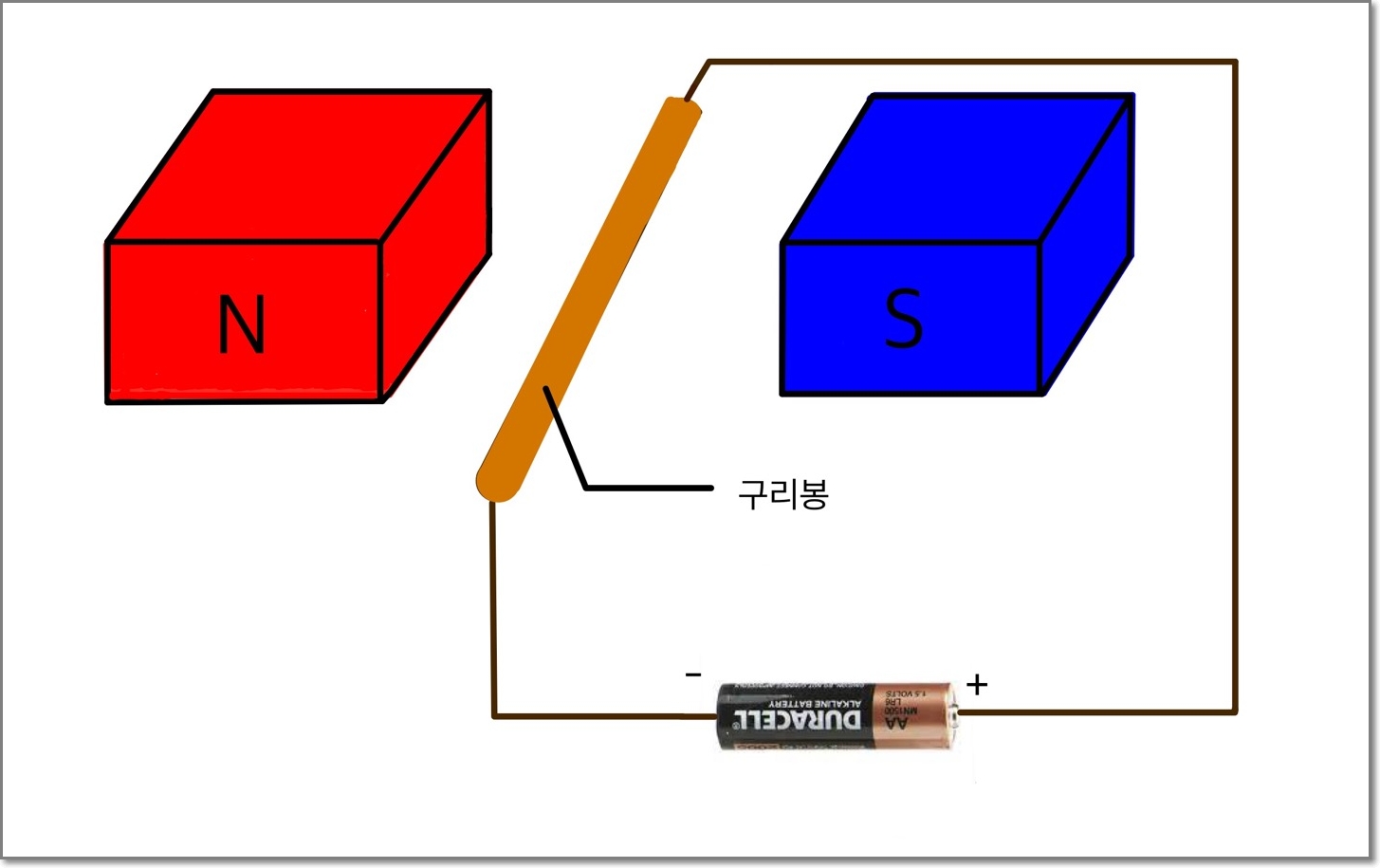사진을 보면 자석 사이에 구리봉을 넣고 전원을 연결 해줍니다. 그랬더니 신기한 현상이 발생하게 됩니다. 구리봉이 전류만 흘려줬을뿐인데, 서서히 위로 움직이는 것입니다. 왜 그런 걸까요 ?