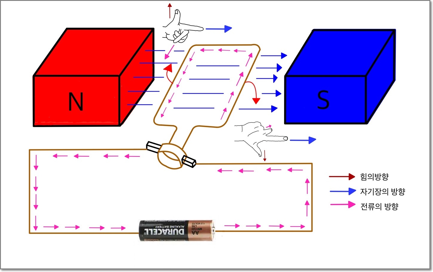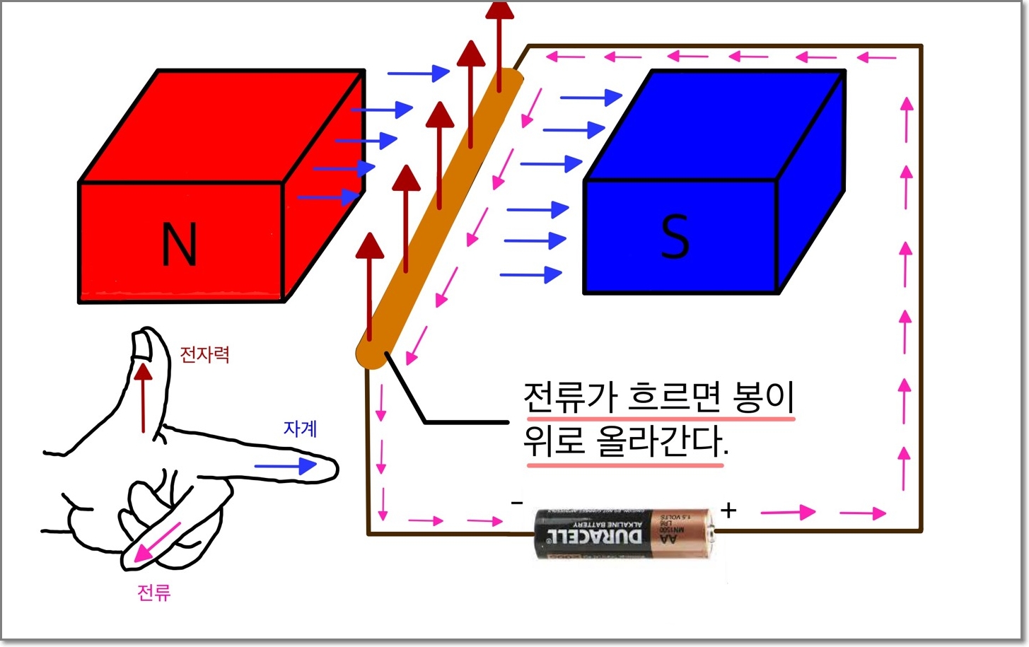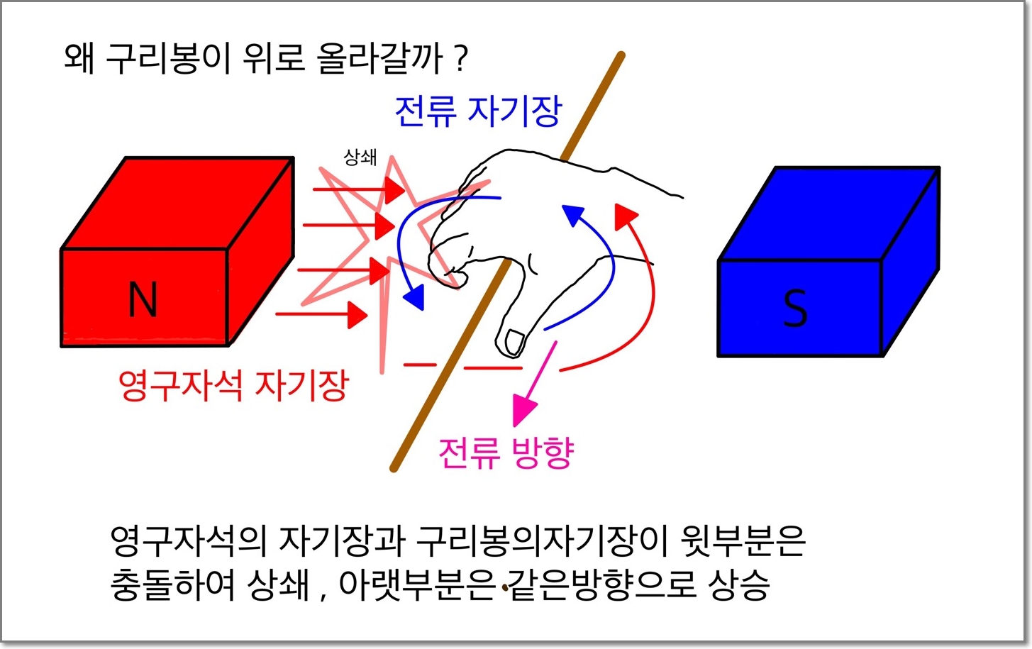 바로 플레밍의 왼손법칙 때문입니다. 전류에 의해 구리봉이 전자석이 되면서 힘이 위로 발생하게 되는 것입니다. 이때 검지 중지 약지를 이용해 힘, 자기장, 전류의 방향을 알 수 있습니다.
