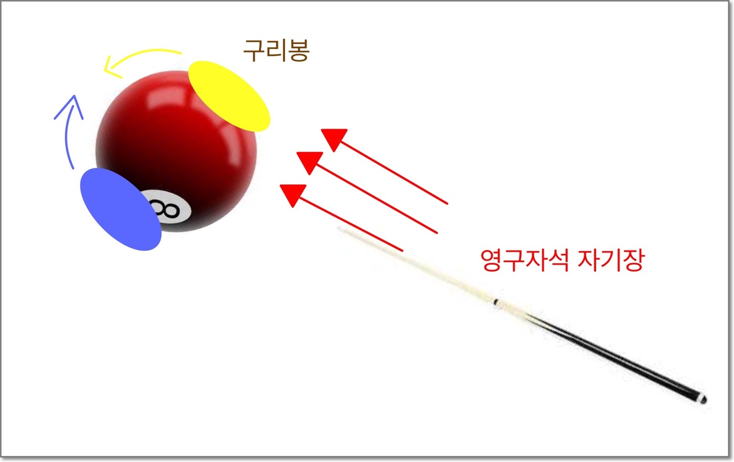 큐대는 영구자석의 자기장이며 당구공의 회전은 구리봉의 자기장이다. 당구공의 어느 부분이 스핀을 받고 이동하는지 알 수 있다.