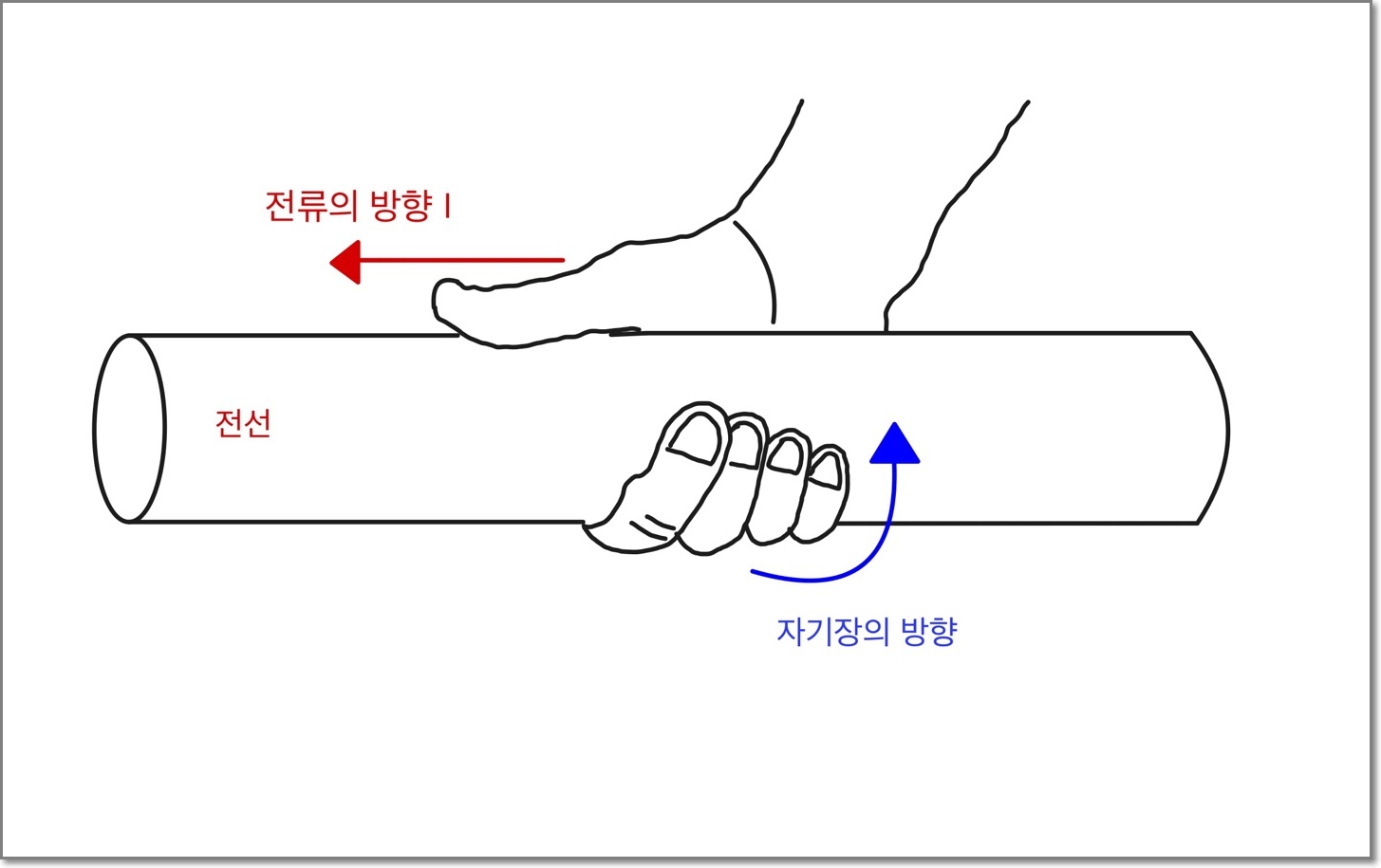 도선에 전류가 흐르면 자기장이 발생하며, 전류와 자기장의 방향을 결정짓는 법칙