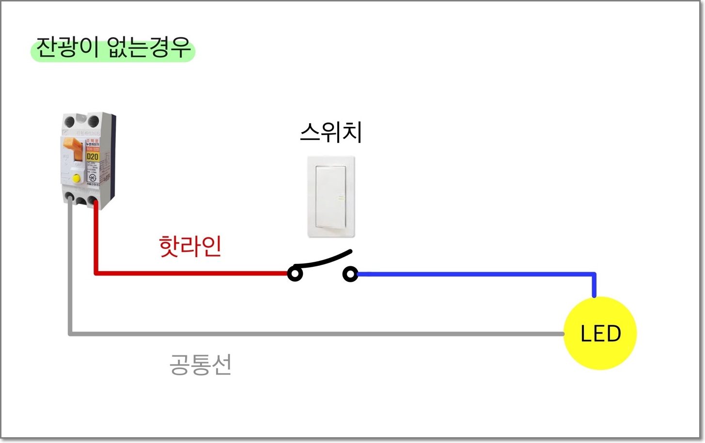 스위치로 가야 할 핫라인이 LED로 직행하게 된다면 스위치를 OFF 해도 미세전류가 LED로 유입됩니다. LED라는 것은 고효율을 가진 전등입니다. 따라서 미세한 전류에도 쉽게 쉽게 반응하는 특징이 있기 때문입니다.