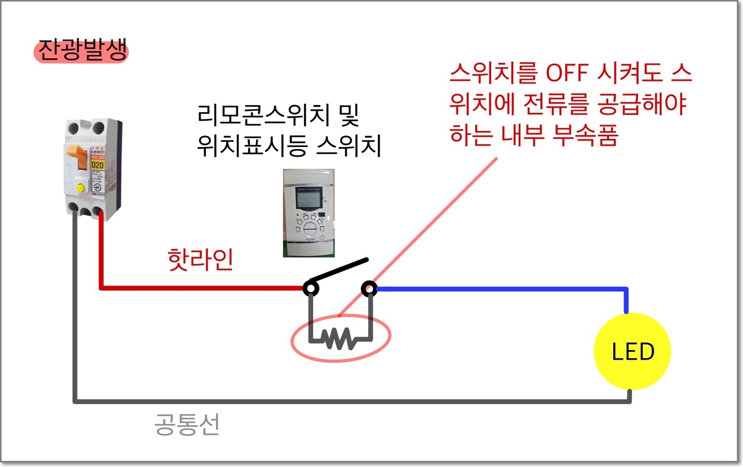 이 두 타입의 스위치들은 스위치를 소등해도 전류를 공급해야 하므로 내부에 아주 작은 LED와 같은 부속품이 내장되어 있습니다. 문제는 스위치에 공급하기 위한 미세전류가 LED까지 공급이 되어버려 잔광현상이 발생하는 것입니다.
