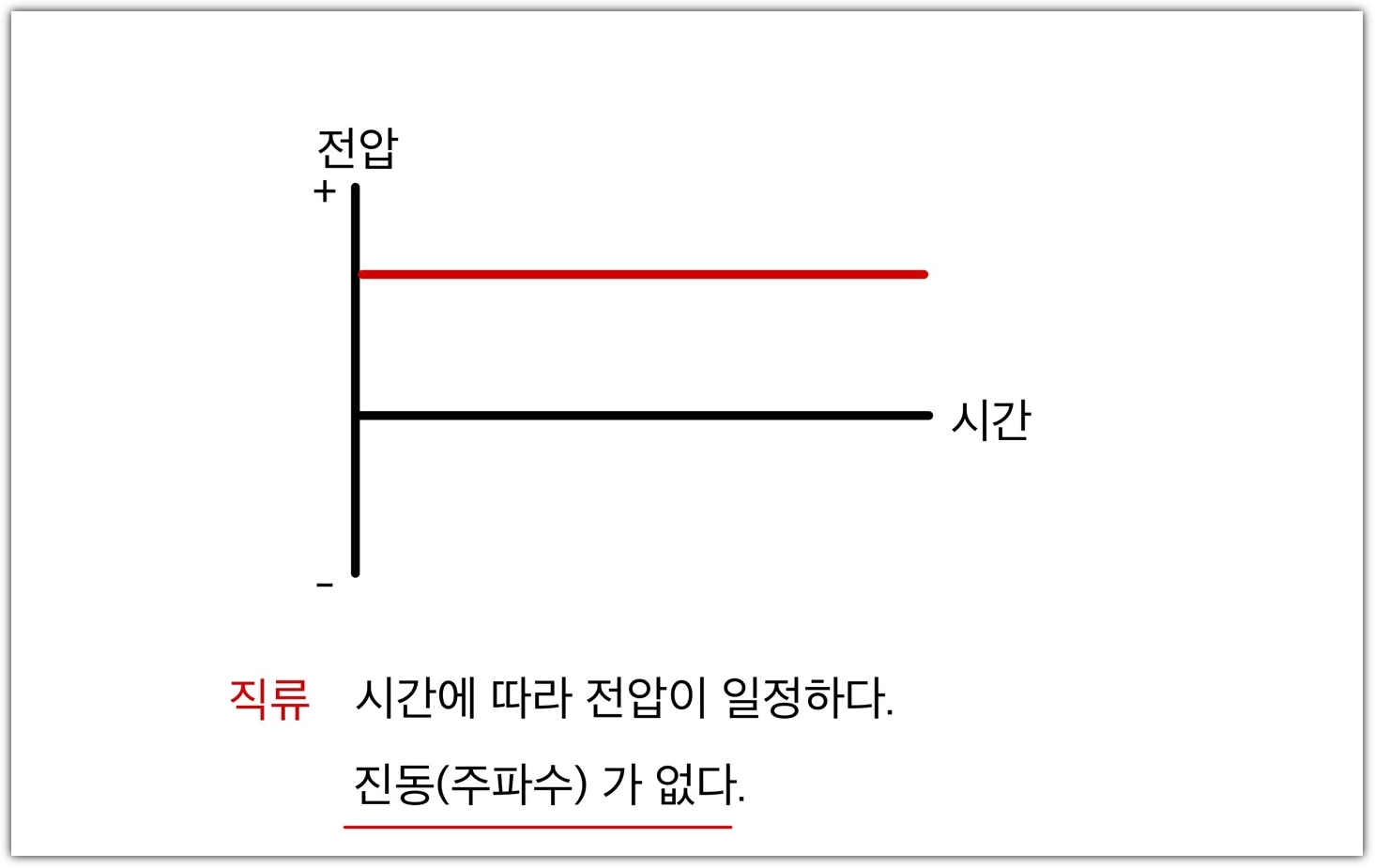 직류의 장점은 진동(주파수) 가 없다는 것입니다. 시간에 따라 전압의 방향이 변하지 않고 일정합니다. 그래프만 봐도 전류의 흐름이 그 어떤 것에도 방해받지 않고 달리는 경주용 차량 같습니다. 여기서 유심히 봐야 할 것은 진동(주파수)이 없다는 것입니다.