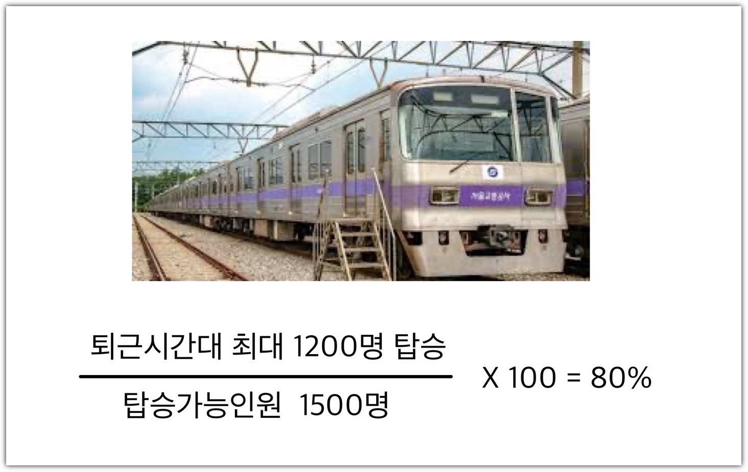 이제 수용률을 알수가 있습니다. 탑승인원이 1500명인 지하철에 최대탑승객이 1200명 이탄 다면 수용률은 80% 즉 , 지하철의 수용률은 80%가 되는 것입니다.