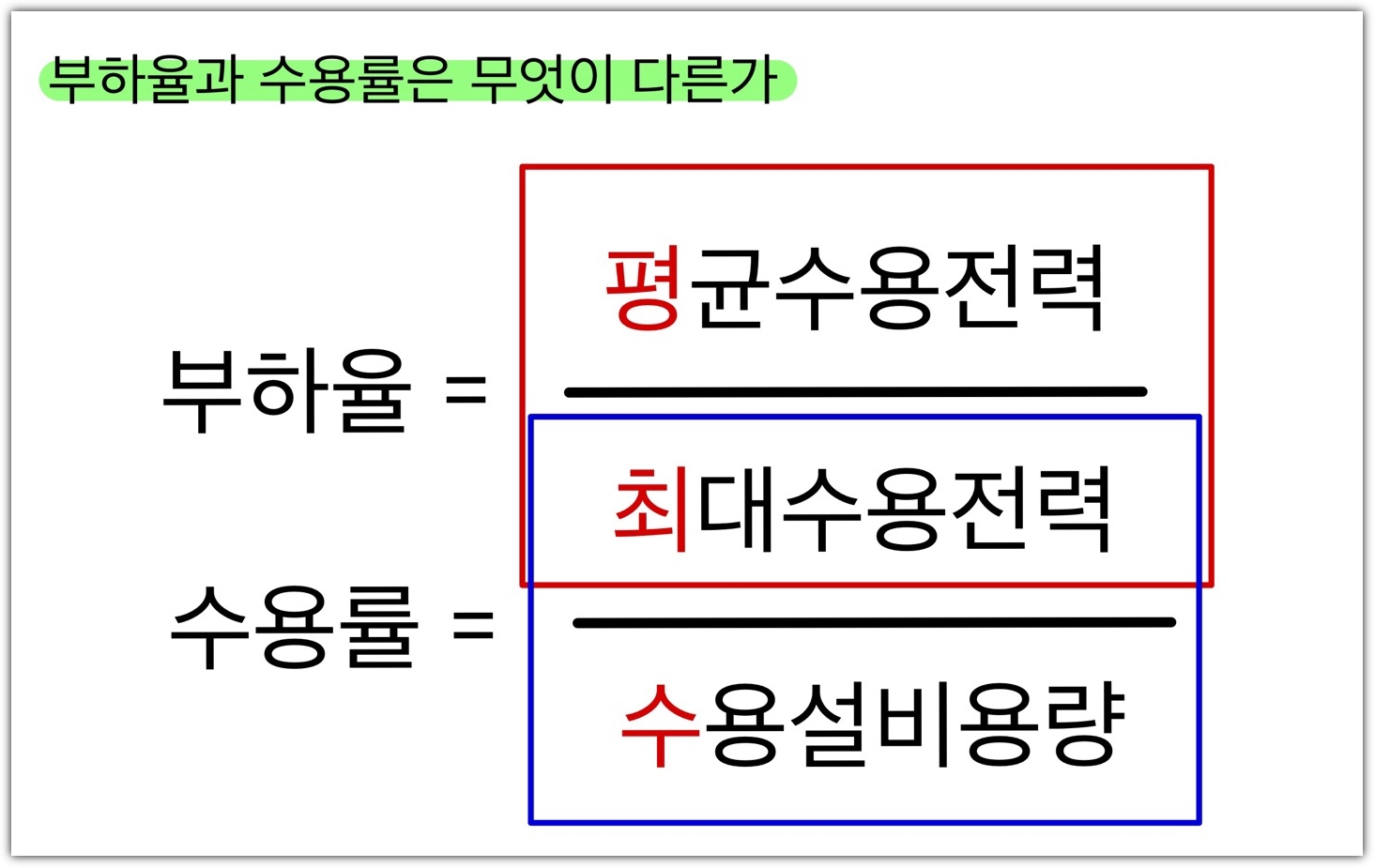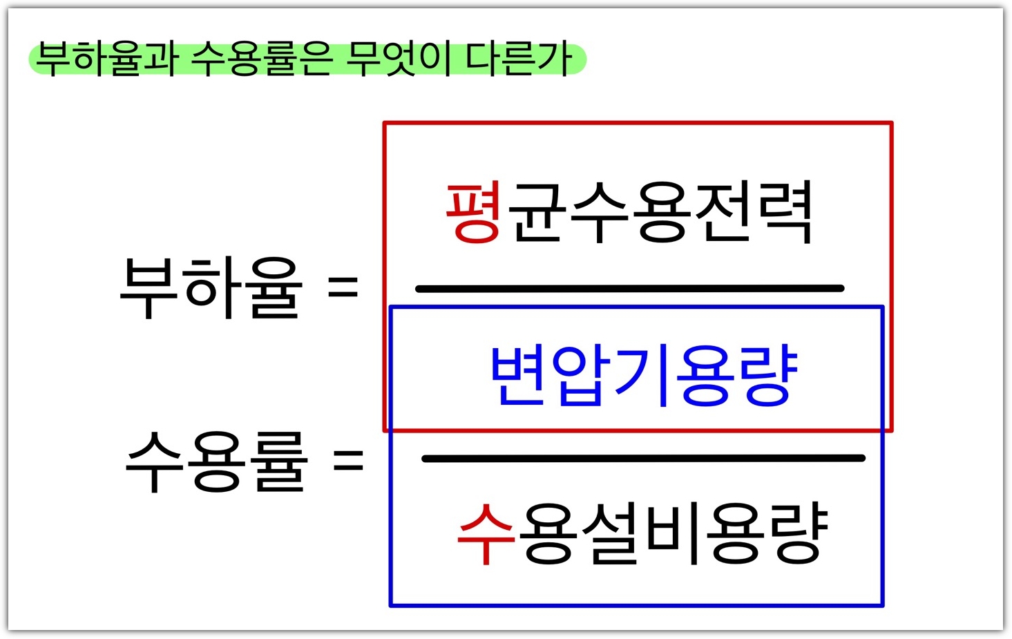 부하율은 평균수용전력을 최대수용전력으로 나눈값이고 수용률은 최대수용전력을 설비용량으로 나눈 것이다. 비슷해 보이지만 엄연히 다른 값이다.