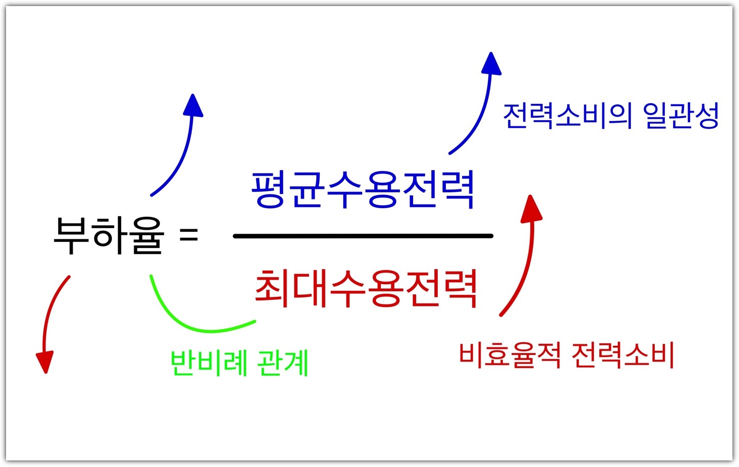 부하율은 "일정기간" 동안 전력사용량을 확인하는 값입니다. 부하율은 평균전력소비를 최대전력소비로 나눈 값인데 만약 부하율이 높다는 것은 최대전력소비가 낮아지고 평균전력소비가 높은것이 되므로 전력사용이 일정하게 유지되는 걸 알 수 있습니다.