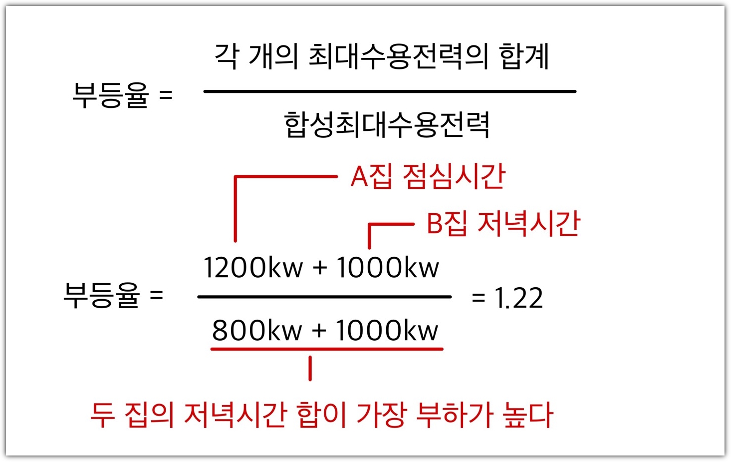 이제 부등률이 무엇을 의미하는지 알 수 있습니다. 집집마다 다른 시간대에 최대로 사용한 전력을 같은시간대에 사용한 전력으로 나누어 주는 값이라는 것입니다. 여기서 핵심은 최대수요전력이란것을 알수 있습니다.