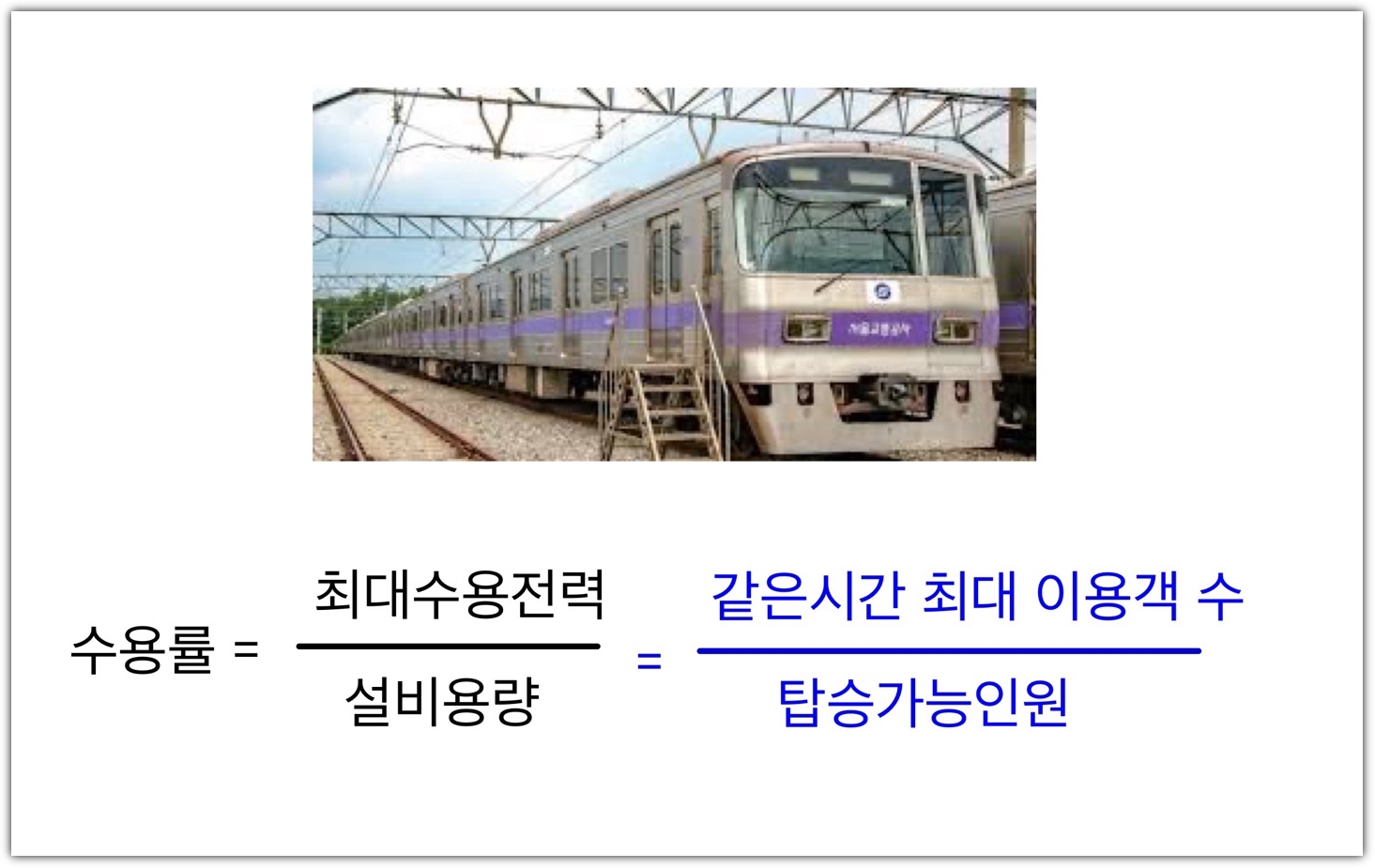 수용률 은 최대수용전력을 설비용량으로 나눈 값입니다. 이렇게 설명하면 그저 이론 객관식 문제 밖에 되질 않습니다. 그래서 간단하게 지하철로 비교를 해보겠습니다.