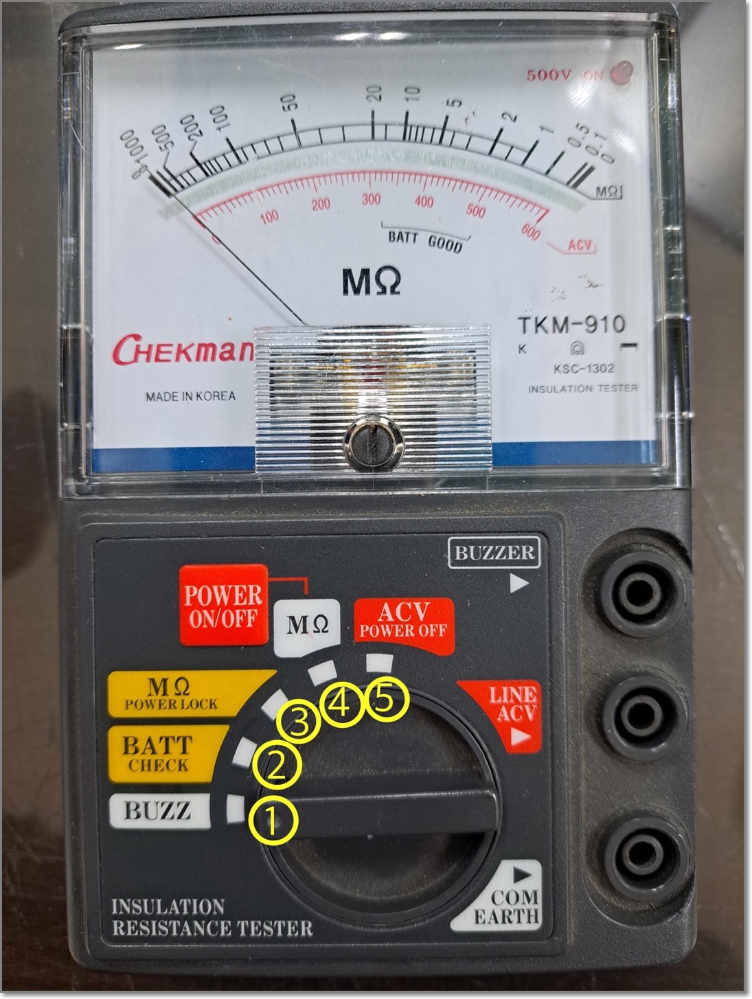 - ③ 절연저항측정(누전테스트) 를 실시하는데 양 단에 500V 를 인가시켜 절연저항을 측정한다.