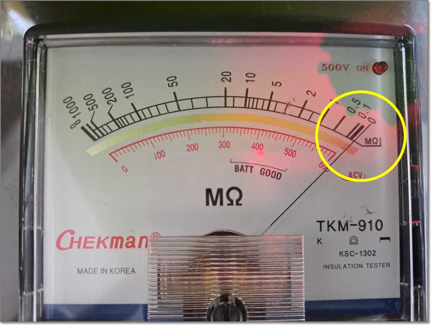 메거는 누전이 의심되는 해당 선로에 직류 500V를 인가합니다. 만약 이때 전류가 새고 있다면 메거의 저항은 1MΩ 보다 낮은 수치를 나타낼 것입니다. 위 사진에선 0을 가리키고 있습니다.